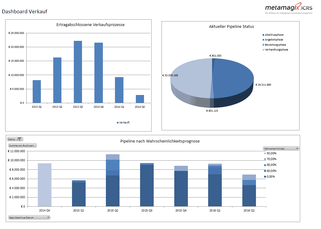 The ICRS Purchase Pipeline enables you to plan, control and document purchase processes. The module documents approvals and files and records milestones and payments. Thus, the object is embedded in the metamagix.ICRS structure as early as the development or transaction phase and can be managed there for its complete lifespan.